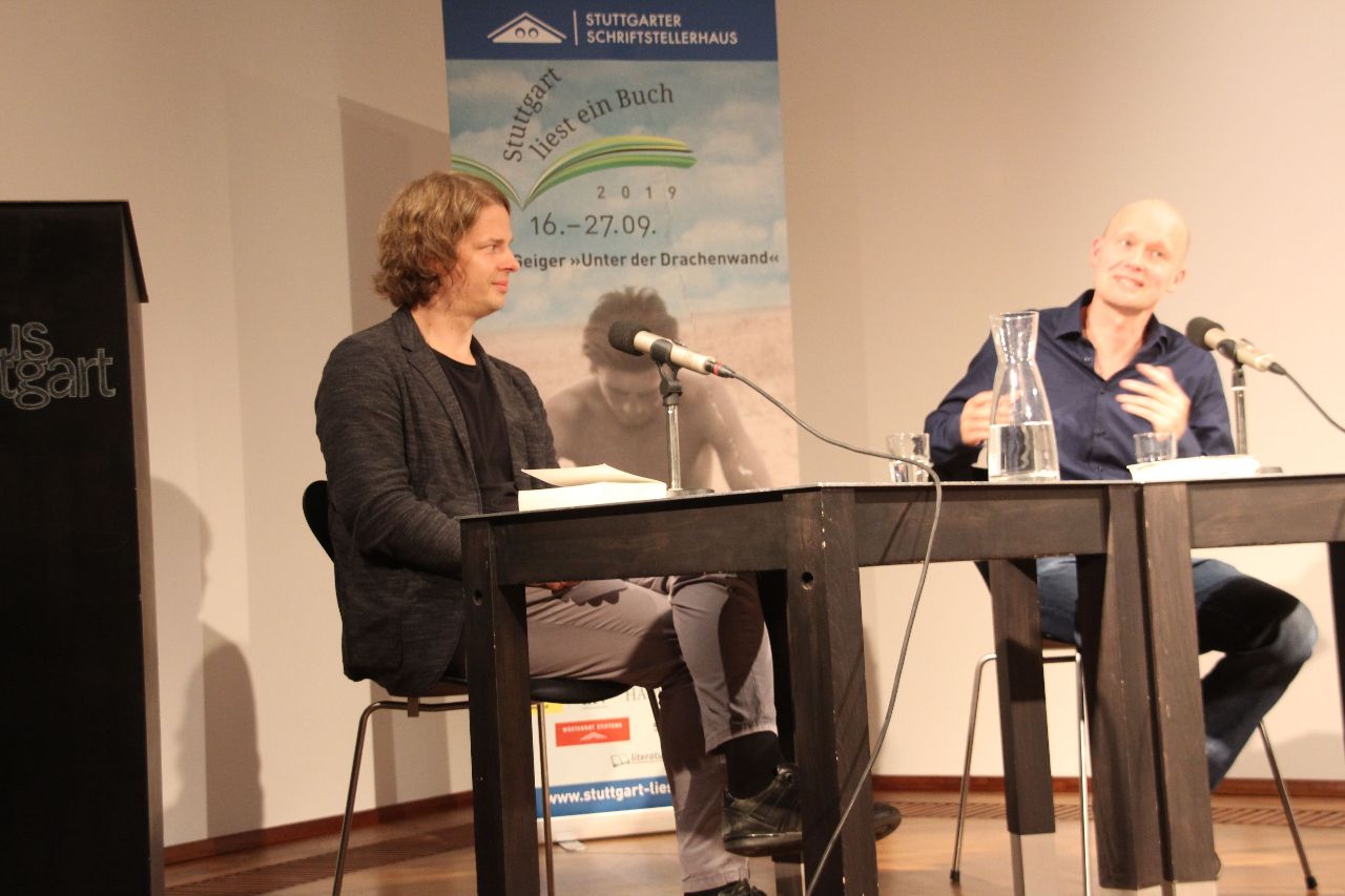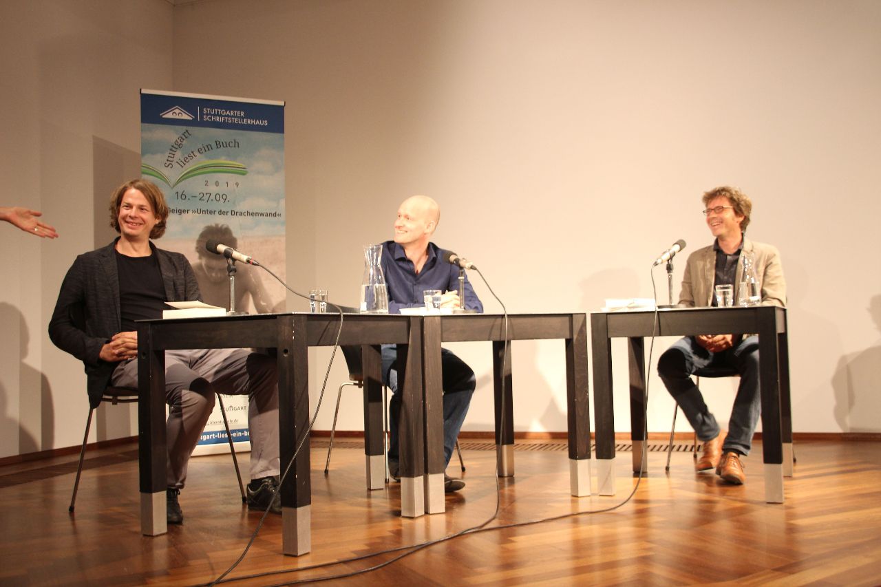 Als Arno Geiger 2018 seinen soeben erschienenen Roman „Unter der Drachenwand“ im Stuttgarter Literaturhaus vorstellte, bezeichnete er ihn in erster Linie als Liebesroman. Das griff die Leiterin des Literaturhauses Dr. Stefanie Stegman an diesem Gesprächsabend, einen Tag nach der Eröffnung, im Rahmen von „Stuttgart liest ein Buch“ gerne auf: Moderiert von Prof. Dr. Thorsten Hoffmann von der Universität Stuttgart diskutierten Arno Geiger und der Stuttgarter Schriftsteller Jan Snela über die Liebesgeschichten in „Unter der Drachenwand“, aber sie sprachen auch über gelingende Liebesbeziehungen und das Schreiben über Sex.