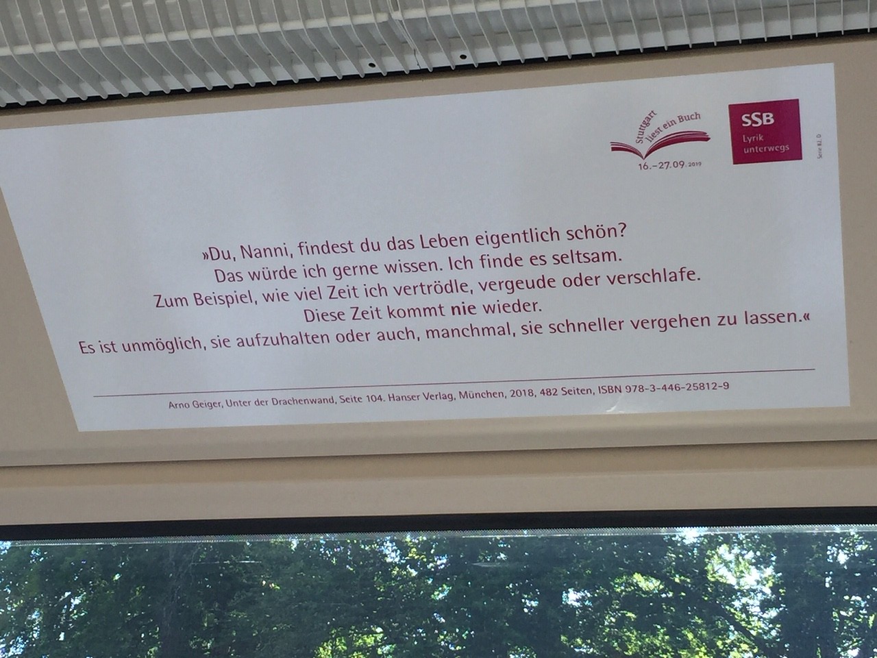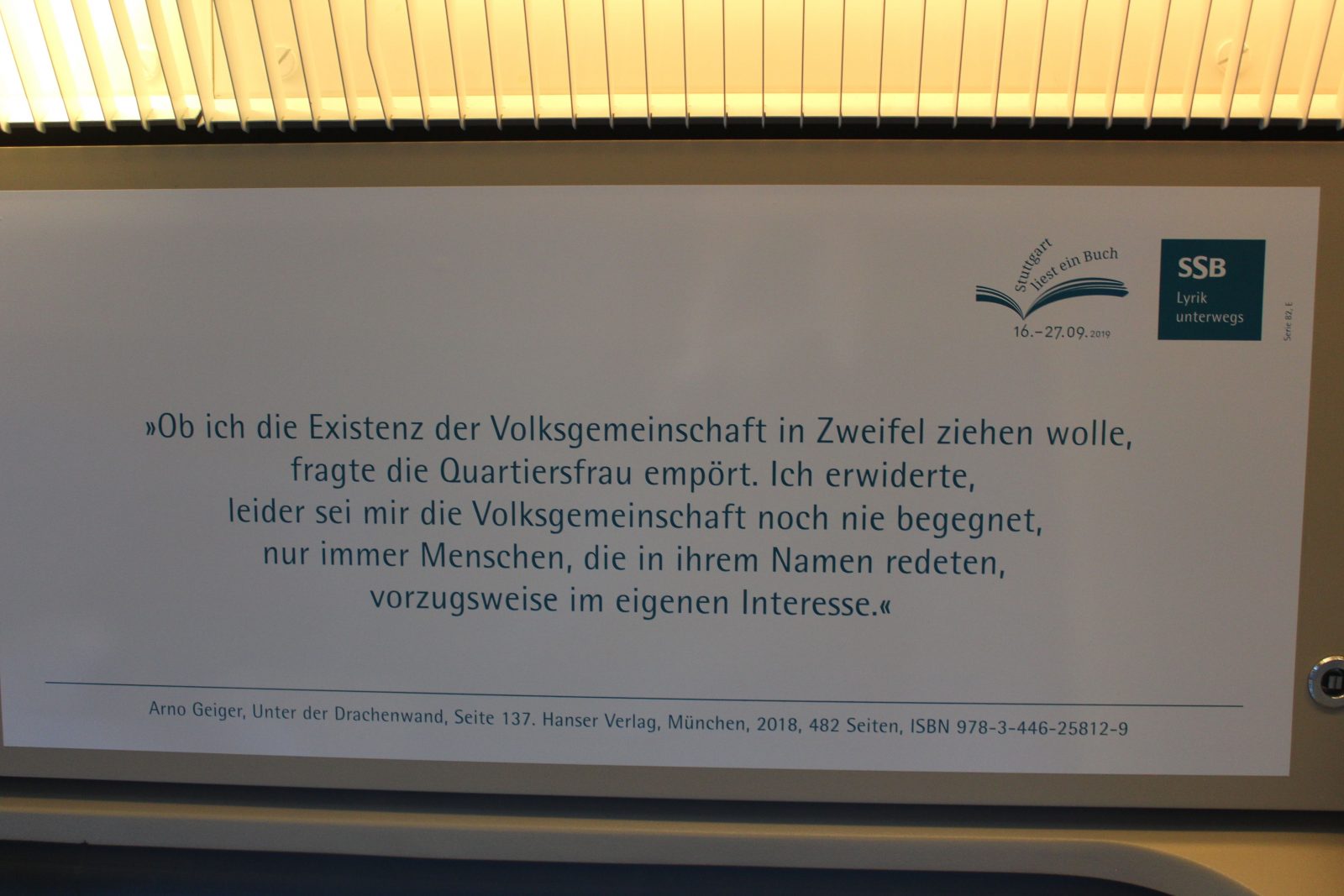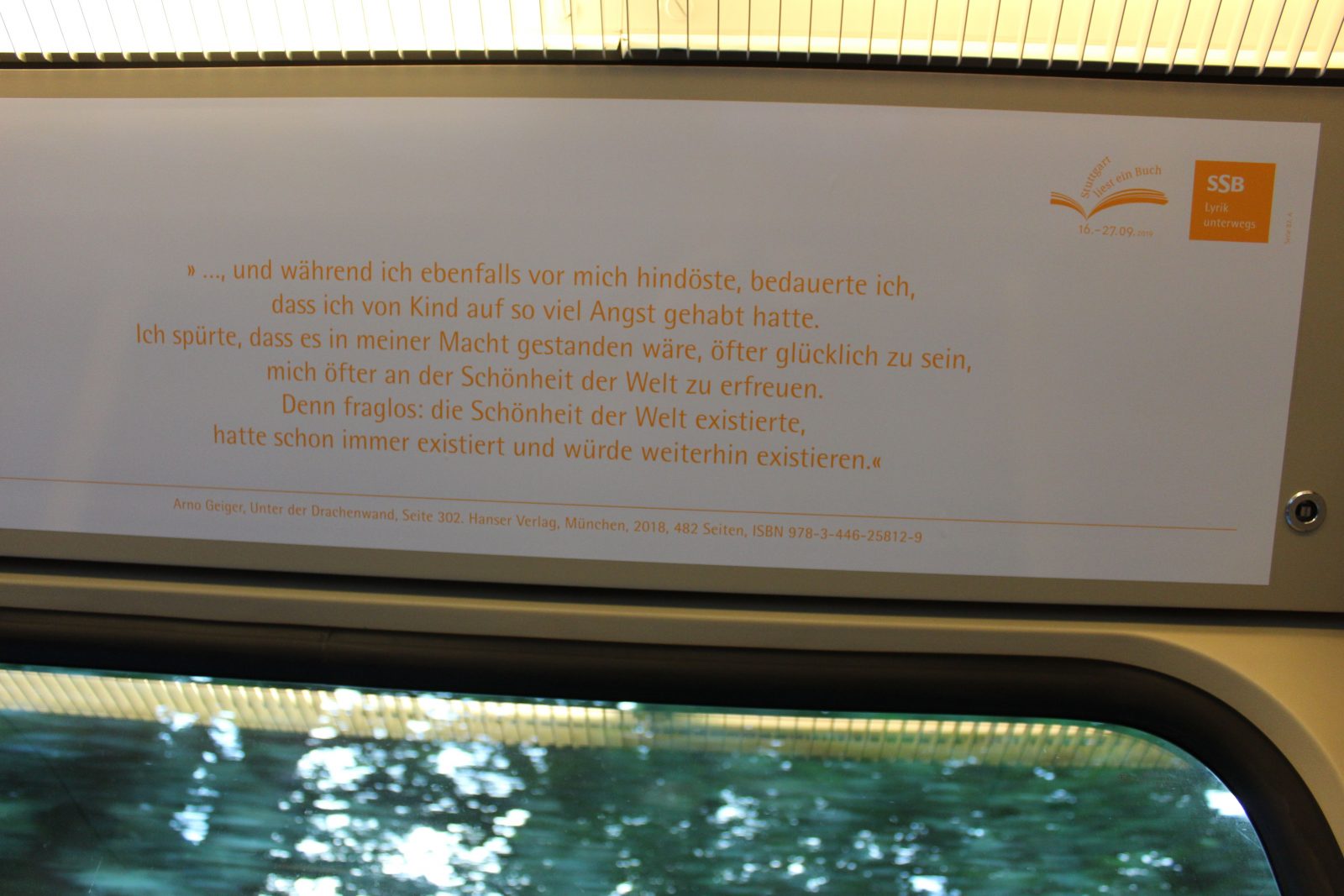Fünf Zitate aus dem Roman von Arno Geiger „Unter der Drachenwand“ laufen seit dem 1. Juli auf wechselnden Linien in den Stuttgarter Straßenbahnen mit. Zu erkennen an dem Logo rechts oben von „Stuttgart liest ein Buch“.