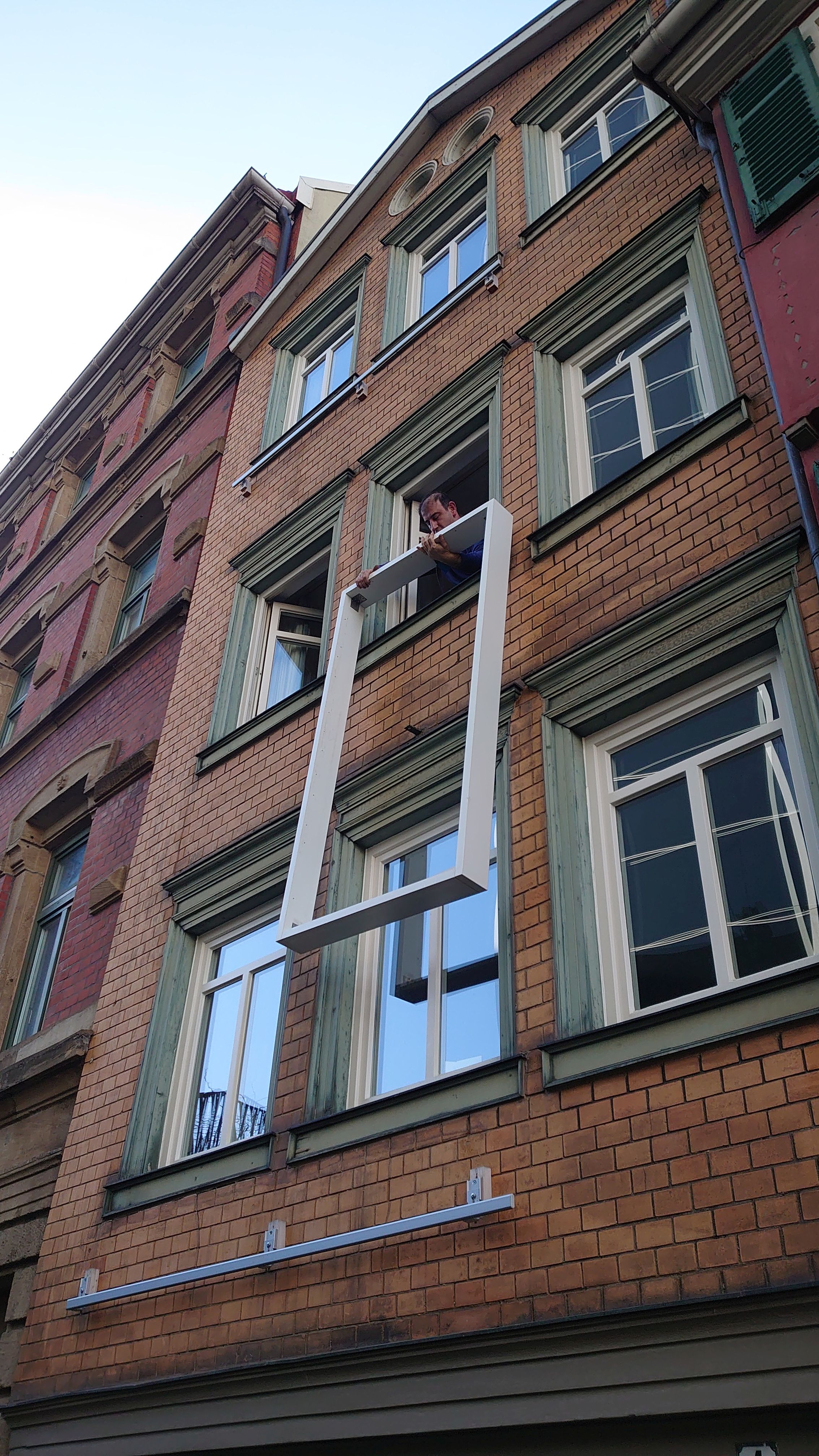 Die Hoffnung, die Bettteile durchs Treppenhaus tragen zu können, erfüllte sich leider nicht, aber so schnell gaben wir nicht auf: Kräftige Gurte wurden um die einzelnen Teile geschlungen und diese kurzerhand durchs Fenster nach unten abgeseilt. Wie schon in der Vergangenheit erfordern die räumlichen Bedingungen im Haus – es handelt sich ja um eine ehemalige Schusterwerkstatt aus dem 17. Jahrhundert – auch besondere Maßnahmen.