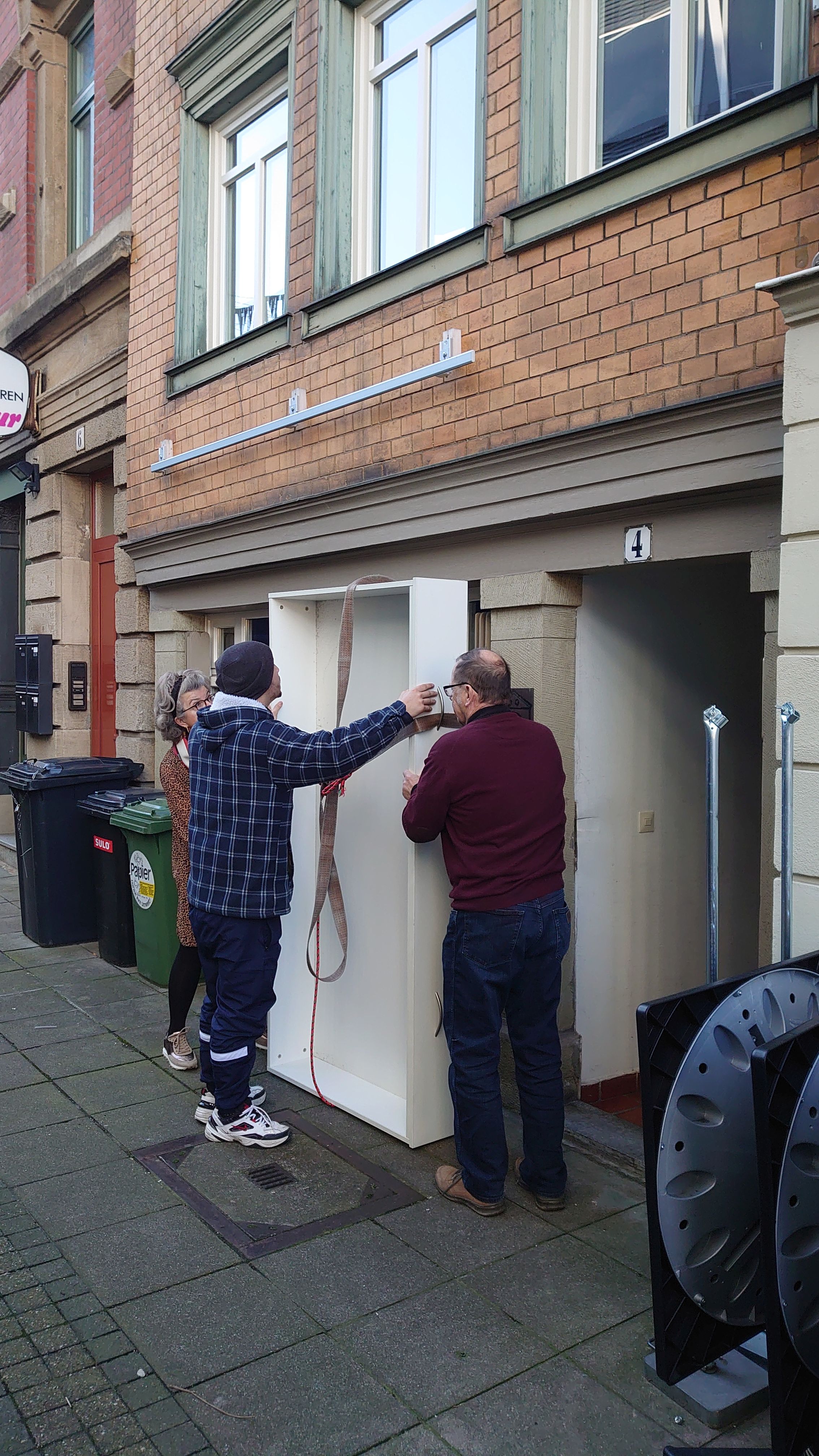 In einem ersten Schritt musste natürlich erst einmal das Zimmer leer geräumt werden. Gar nicht so einfach in unserem denkmalgeschützten Haus mit verwinkeltem Treppenhaus! Ein tüchtiger Handwerker wurde über myhammer gesucht und gefunden und Vater und Sohn rückten an einem Samstagmorgen im Februar an, um Regale und Bett abzubauen. Auch Schriftführer Michael Seehoff und Susanne Martin hatten sich neben Astrid Braun noch eingefunden, um den heiklen Abtransport zu gewährleisten.