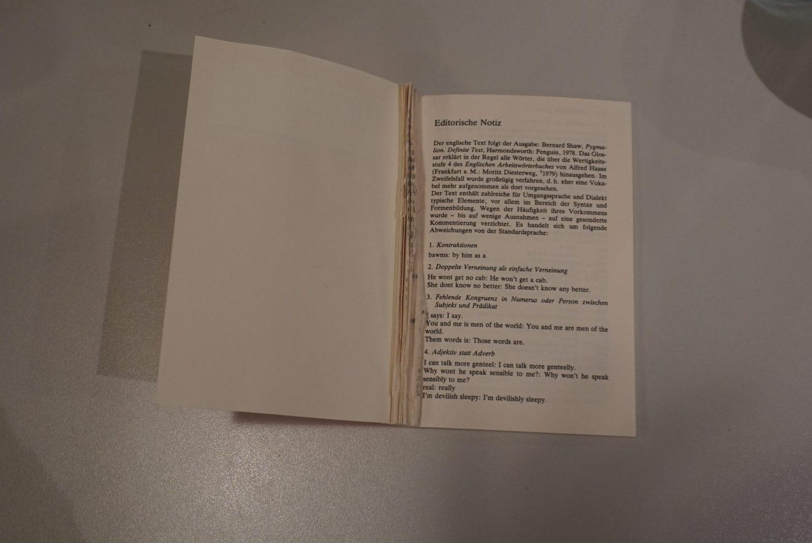 Im Gegensatz zum Text der ersten Sitzung wurde an diesem Montag ein Theaterstück mit einer zusammenhängenden Handlung gelesen: „Pygmalion“ von Bernard Shaw. Das kleine Reclamheftchen wurde in acht Teile zerrissen und an alle Teilnehmenden verteilt. In der folgenden Lesephase wurden fleißig die Textmarker und Stifte benutzt, Gedanken notiert und versucht, Passagen zu interpretieren. Es ergab sich teilweise erst in der Diskussion, in welcher Beziehung bestimmte Figuren stehen, oder wie Situationen entstanden sind. Aber: auch wenn einem beim Lesen der Kontext fehlte, so konnte jede Person doch einiges aus ihrem Teil schließen.