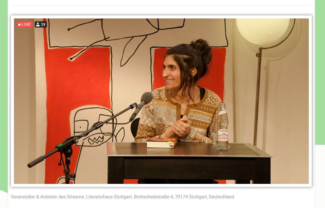 Der Abend wurde vom Literaturhaus Stuttgart in Kooperation mit dem Stuttgarter Schriftstellerhaus und SWR 2 organisiert. Das Gespräch wurde vom SWR aufgezeichnet und am 27.4.2021 in der Reihe „Junge Autor*innen“ ausgestrahlt. Sie können es hier nachhören (Audio, 69 Min.)