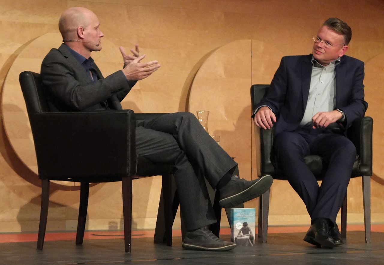 Kollege und Literaturspezialist Wolfgang Tischer vom literaturcafe.de moderierte die Auftaktveranstaltung und stellte den vor „Glückseligkeit“ mit den Armen rudernden Arno Geiger dem Publikum vor. Er führte mit österreichischen Autor Arno Geiger ein ausführliches Gespräch über seinen Roman Unter der Drachenwand und über seine Arbeit als Schriftsteller. Mehr als 10 Jahre hat Arno Geiger an diesem Roman gearbeitet.