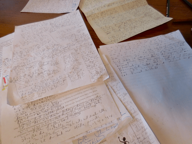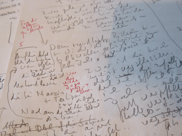 Und da finde ich sie, die Fotos von diesem so lebendigen, vor Geist und Witz so sprühenden Dichter, der 2015 die Wohnung im obersten Stockwerk vom Schriftstellerhaus als Stipendiat bewohnte, und mir gestattete, sein Arbeitsmaterial, zig sorgsam gespitzte Bleistifte (es waren aber auch Stummel dabei) abzulichten und einen Blick auf den Schreibtisch zu werfen, an dem er – meistens nachts – seine Texte be- und umarbeitete, bis er zufrieden war. Das trieb ihn in so manchen Nächten aus dem Bett wieder hin zum Schreibtisch und manchmal stolperte er noch ermattet und mit wirrem Haupthaar von der Nächte Arbeit die Treppe herunter.