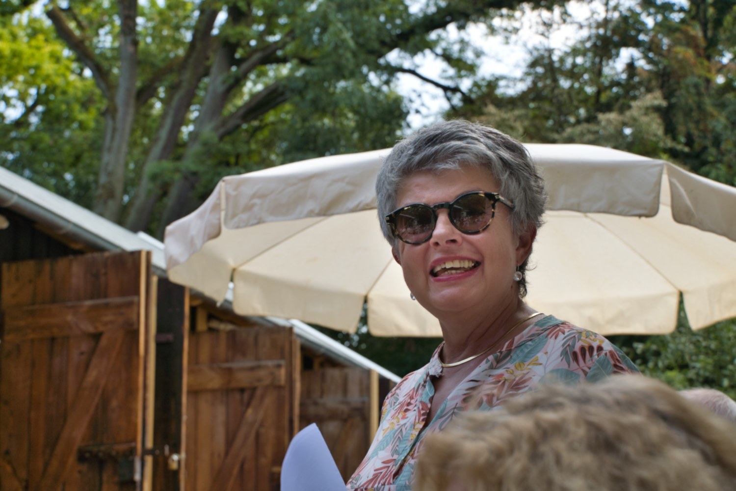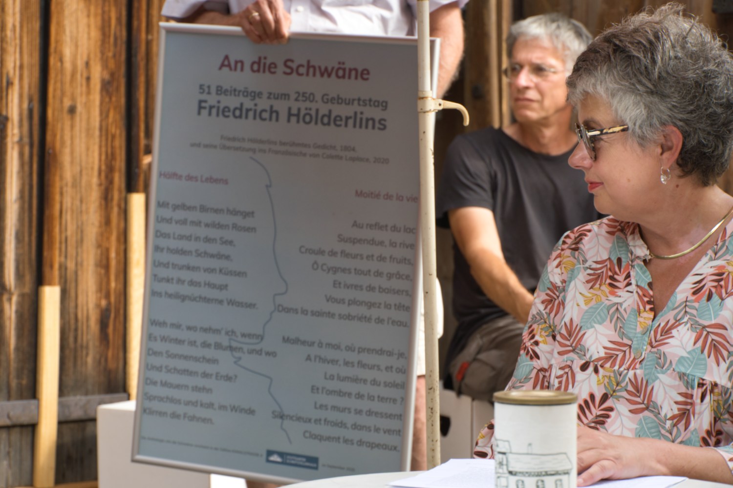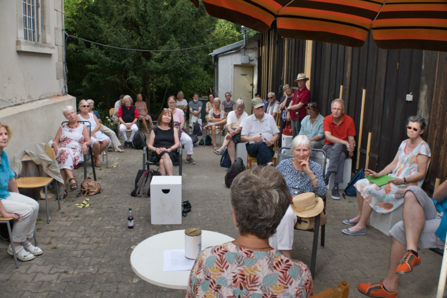 Endlich mal wieder unter Menschen: Das Garnisonsschüzenhaus am Dornhalden-Friedhof in Stuttgart-Degerloch und der Verein Garnisonsschützenhaus unter dem Vorsitz von Reinhard Schmidhäuser machten es möglich. Wir konnten eine Vorab-Lesung am wohl heißesten Tag bislang im Freien abhalten. Die Anthologie unter dem Titel „An die Schwäne“ vereint 51 Beiträge von Autorinnen und Autoren, die dem Schriftstellerhaus verbunden sind, unter dem Motto „Hälfte des Lebens“, dem wohl bekanntesten Gedicht Friedich Hölderlins.