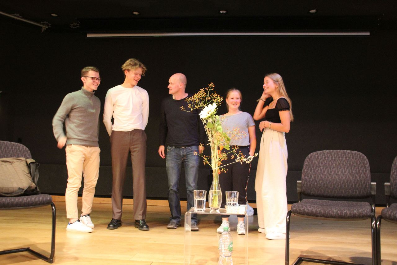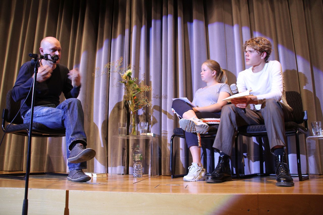 Heidehof liest ein Buch – unter diesem Motto haben sich Schülerinnen und Schüler der Kaassen 8 – 12 aus dem Evangelischen Heidehof-Gymnasium Stuttgart mit dem Text auseinandergesetzt und Hintergründe recherchiert. Die unteren Klassenstufen hatten einzelne Ausschnitte gelesen, die oberen Klassenstufen den ganzen Roman. Diese intensive Auseinandersetzung merkte man der souveränen Moderation und Gesprächsführung der 4 Schülerinnen und Schüler an, die sich zwischen 2 Leseabschnitten mit Arno Geiger unterhielten.