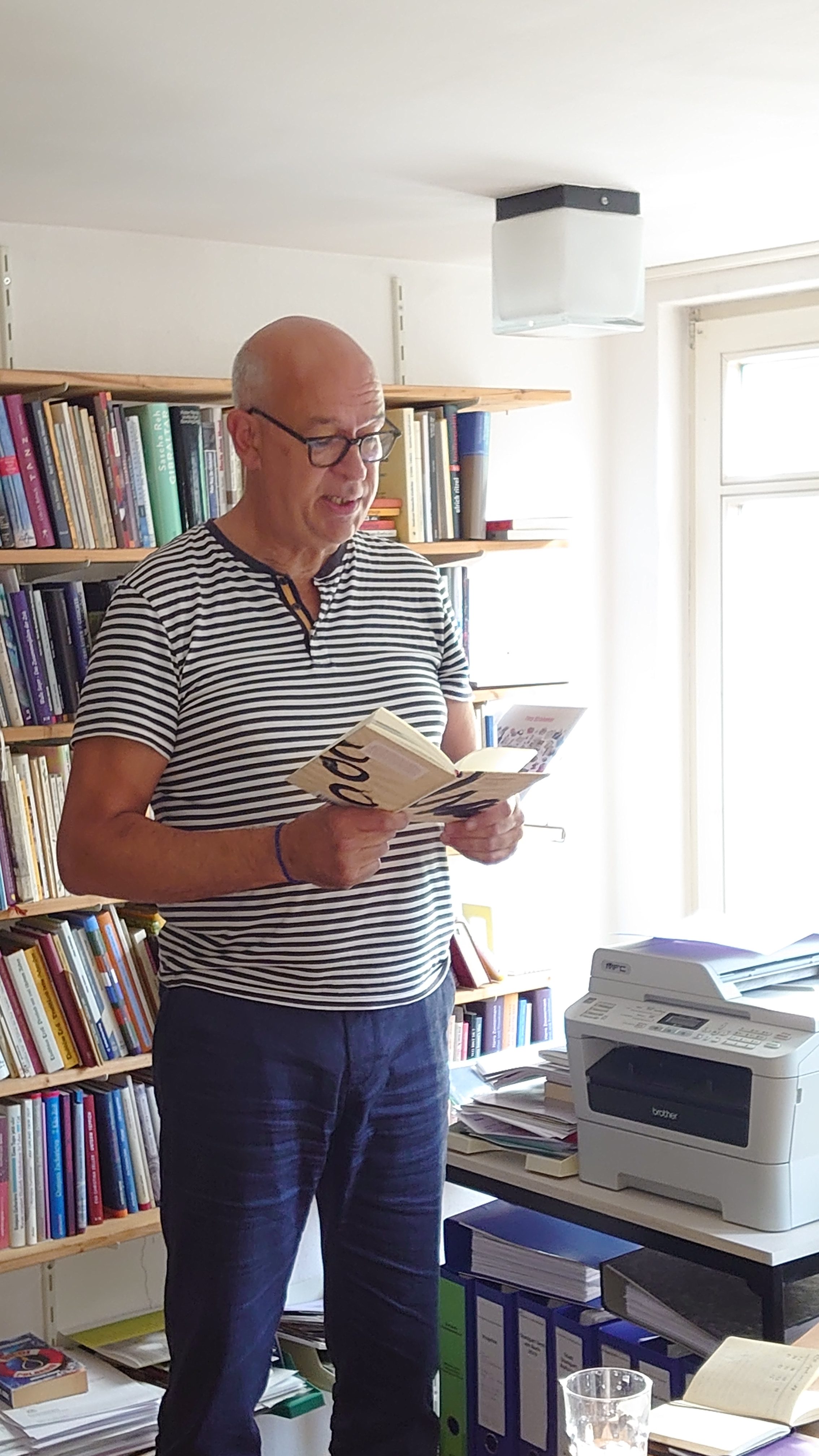 Im Haus präsent waren die ehemaligen Lyrik-Stipendiat:innen Raoul Eisele (im Tonstudio), Katharina Ferner (in der Stipendiat:innenwohnung), Odile Kennel (im Gästezimmer), Achim Wagner (Keller) sowie der Stuttgarter Autor Mathias Jeschke (Büro AB). Mitglieder des jungen Schriftstellerhauses traten als Lyrik-Combo auf mit einem extra für den Tag geschriebenen Langgedicht, das sie mit Verve im Erdgeschoss vortrugen.