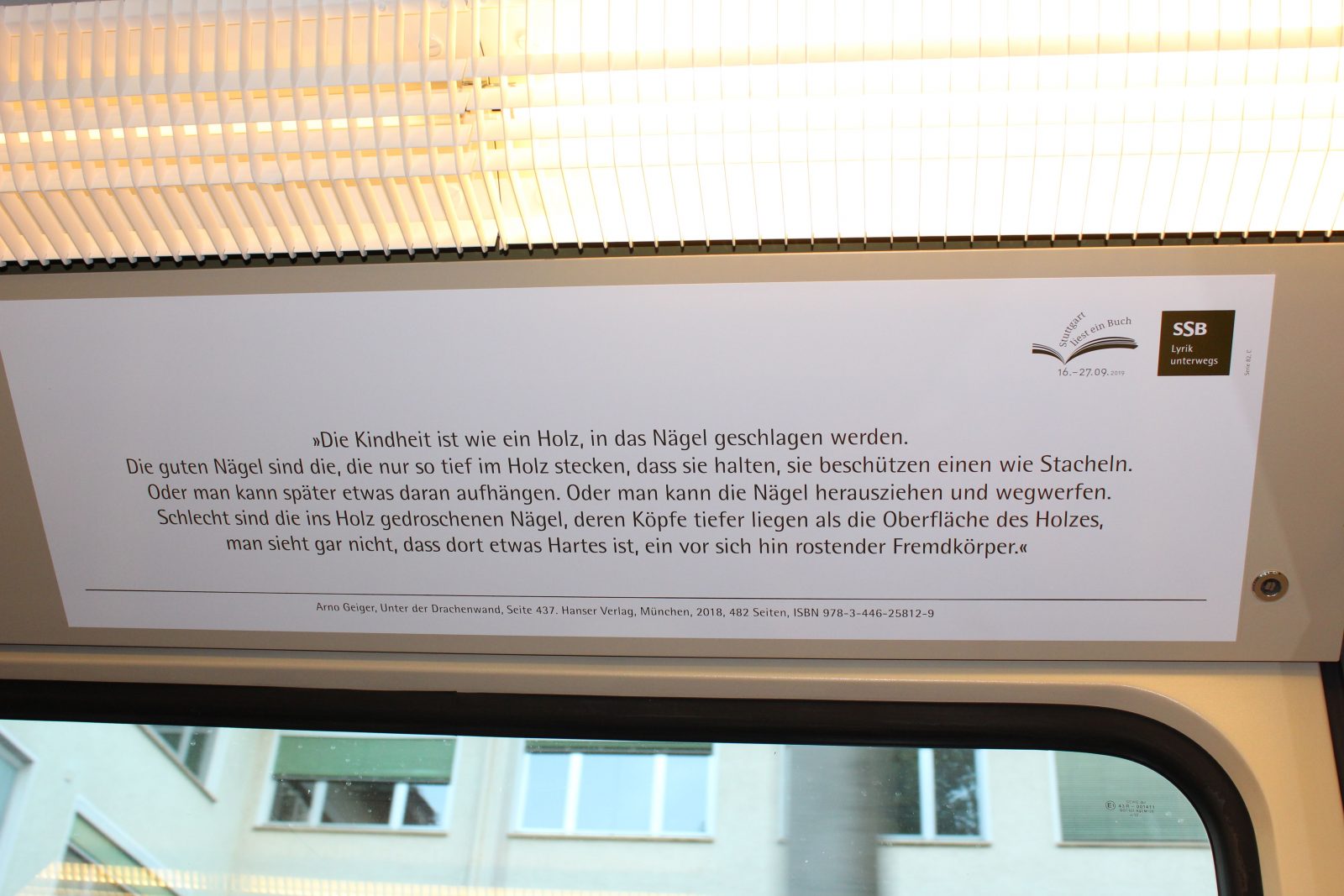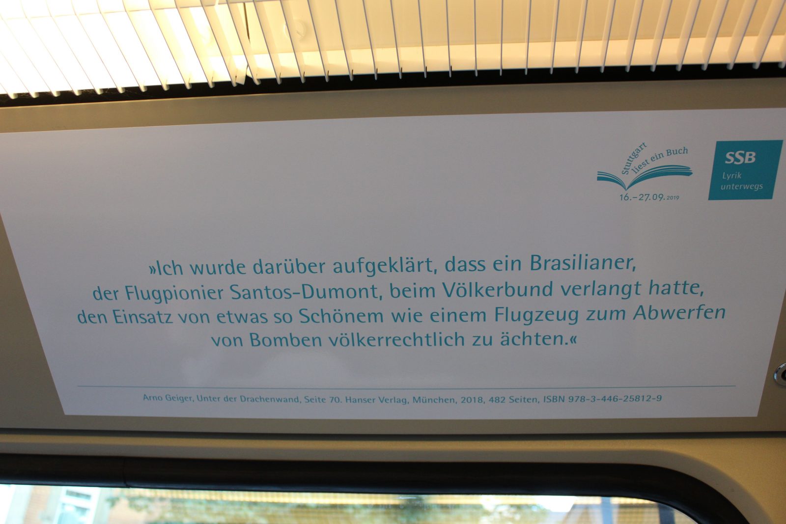 Fünf Zitate aus dem Roman von Arno Geiger „Unter der Drachenwand“ laufen seit dem 1. Juli auf wechselnden Linien in den Stuttgarter Straßenbahnen mit. Zu erkennen an dem Logo rechts oben von „Stuttgart liest ein Buch“.