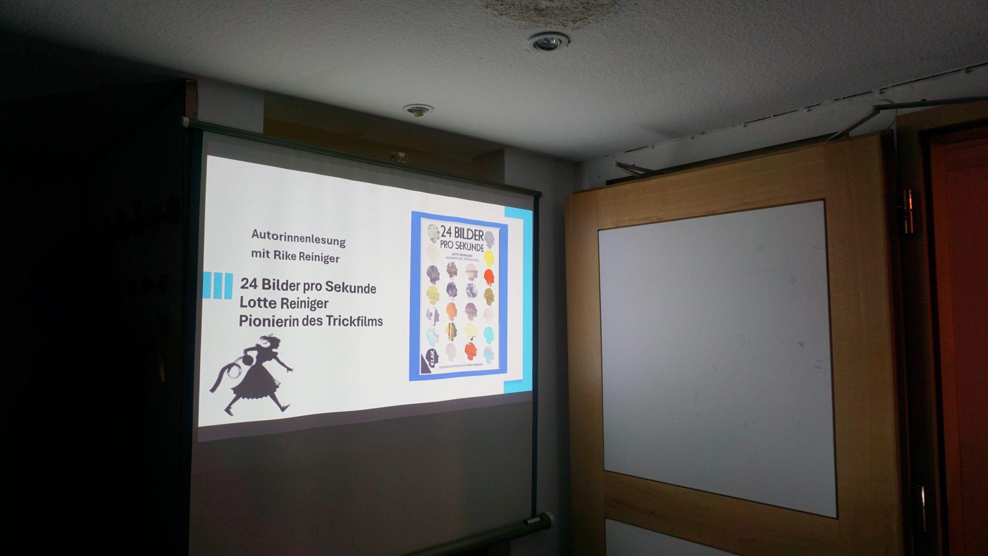 Aus diesem las Frau Reiniger vor: Die Zuhörenden durften Passagen über Lottes junge Liebe zu ihrer Freundin aus Kindheitstagen, ihren Weg in die Schauspielschule, und ihre ersten Trickfilme lauschen. Veranschaulicht wurden die Lesestellen von Fotos und Teilen ihrer Filme. Darunter war auch ein Ausschnitt aus dem ersten Langtrickfilm der Welt: Lottes „Die Abenteuer des Prinzen Achmed“.