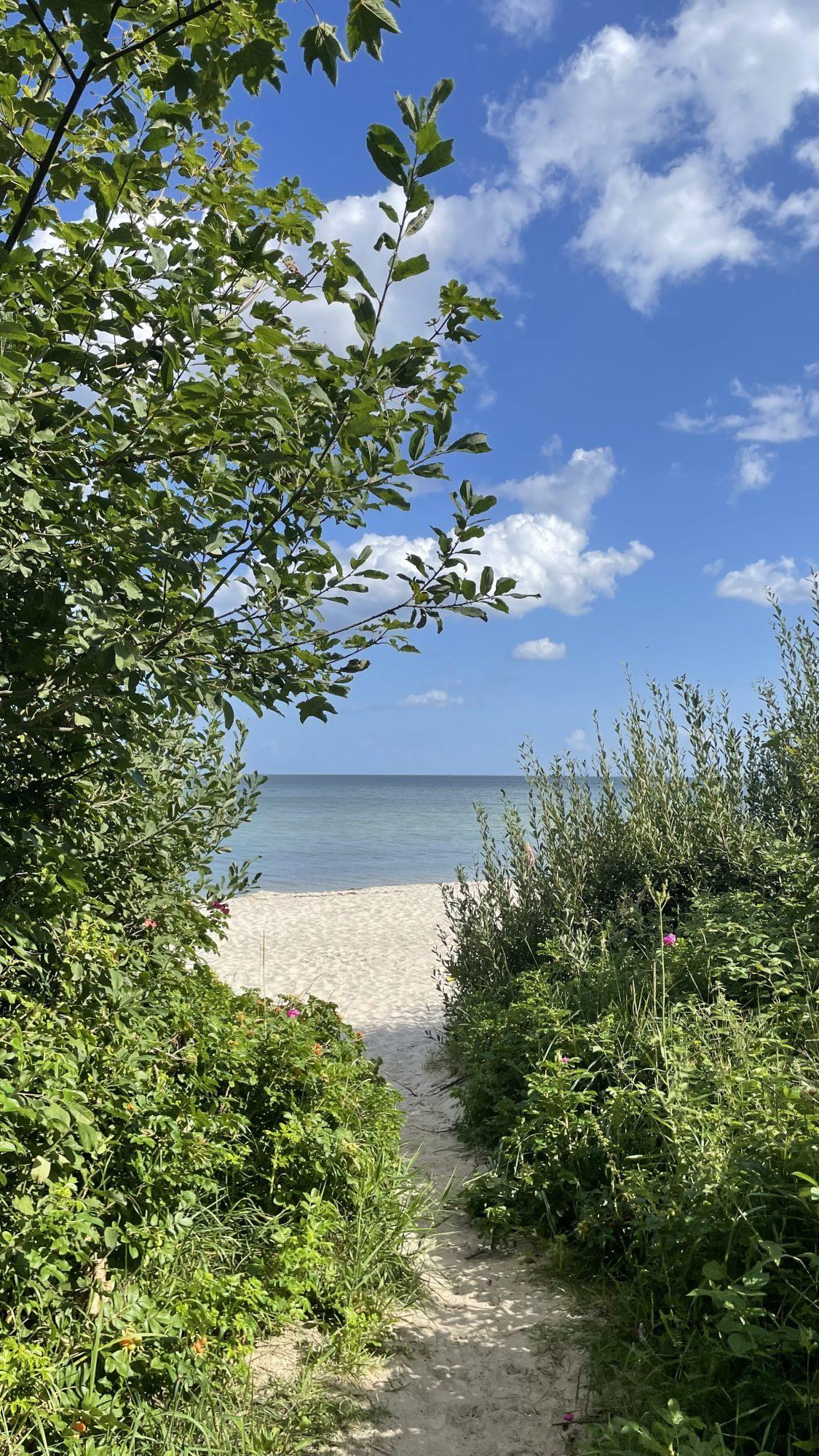 Nur fünfzehn Minuten, ein paar gute Lieder und einen Trampelpfad braucht es, bis die Ostsee uns mit strahlend blauem Wasser, hellem Sand und einer frischen Brise begrüßt. An diesem sonnig-wolkigen Tag ist kaum jemand da und wir haben den Abschnitt fast für uns alleine. Die Handtücher werden ausgebreitet, Fee und Catarina trauen sich ins kalte Wasser, während Robin und Alice am Ufer über ihre Ideen plaudern.