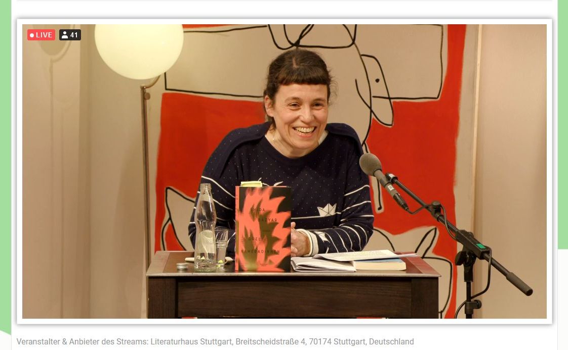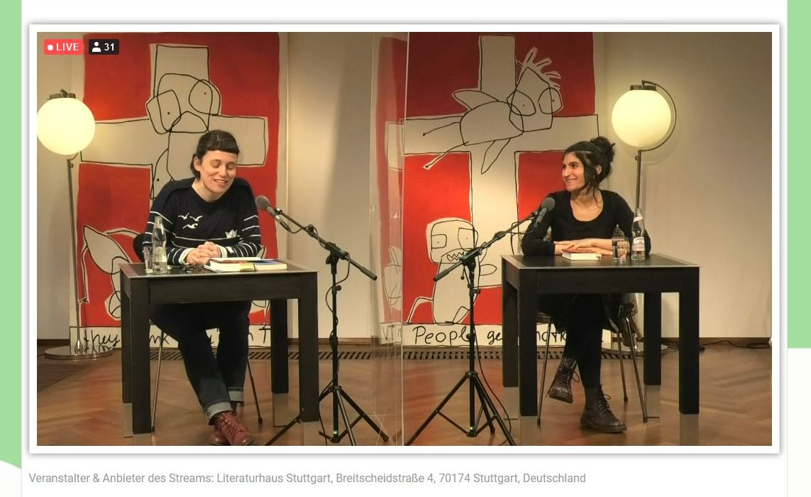 Der Abend wurde vom Literaturhaus Stuttgart in Kooperation mit dem Stuttgarter Schriftstellerhaus und SWR 2 organisiert. Das Gespräch wurde vom SWR aufgezeichnet und am 27.4.2021 in der Reihe „Junge Autor*innen“ ausgestrahlt. Sie können es hier nachhören (Audio, 69 Min.)